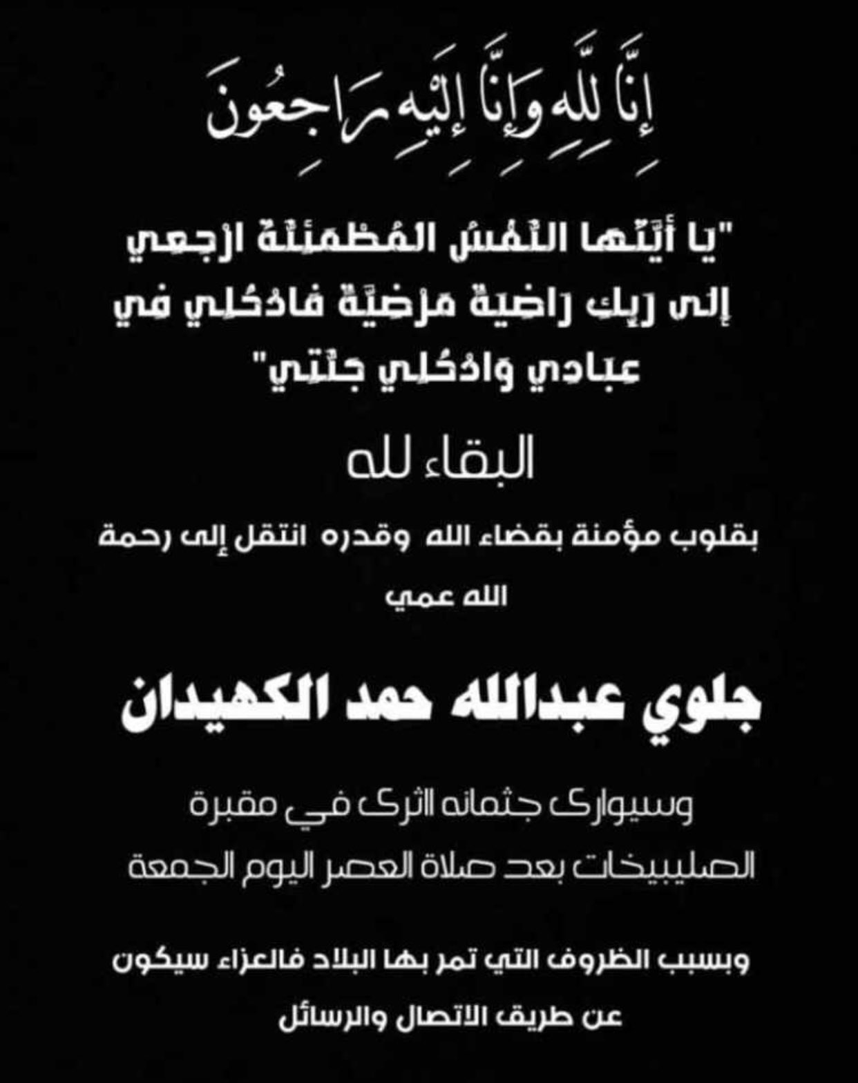 بدر الدابان Twitterissa بقلوب مؤمنة مطمئنة راضية بقضاء الله وقدره انتقل إلى رحمة الله تعالى عمي مطلق زايد الحربش الدفان بمشيئة الله يوم السبت بعد صلاة العصر في مقبرة الصليبيخات