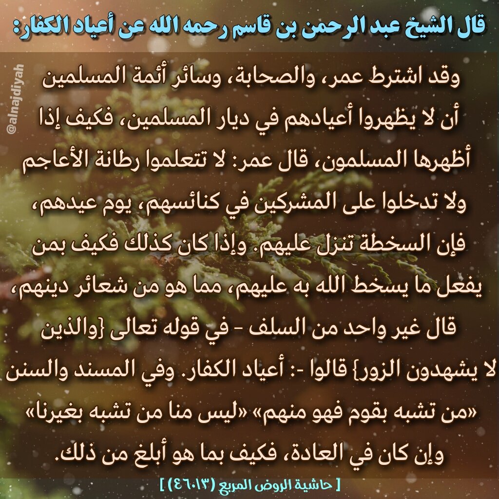 أئمة الدعوة النجدية On Twitter قال غير واحد من السلف في قوله تعالى والذين لا يشهدون الزور قالوا أعياد الكفار وفي المسند والسنن من تشبه بقوم فهو منهم Https T Co Wsxdkv4yyz