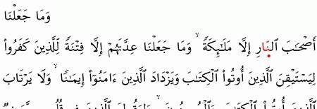 أسباب نزول آيات القرآن و م ا ج ع ل ن ا أ ص ح اب الن ار إ ل ا م لائ ك ة و م ا ج ع ل ن ا ع د ت ه م إ ل ا ف ت ن ة ل ل ذ ين ك ف ر وا ل ي س ت ي ق ن ال ذ ين أ وت وا ال ك ت اب و ي ز د اد ال ذ ين آم ن وا إ يم انا و لا ي ر ت اب ال ذ ين
