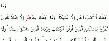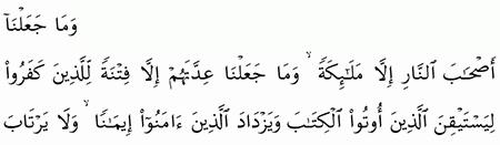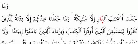 On Twitter وما جعلنا أصحاب النار إلا ملائكة وما جعلنا عدتهم إلا فتنة للذين كفروا ليستيقن الذين أوتوا الكتاب ويزداد الذين آمنوا إيمانا سورة المدثر